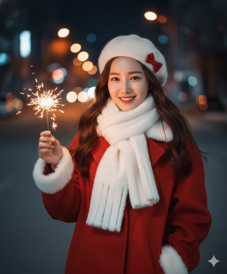 Photorealistic portrait of a young East Asian woman in her early 20s with long wavy brown hair cascading over shoulders, soft curtain bangs framing her round symmetrical face, large round doe eyes with subtle sparkle, fair porcelain skin with natural glow, soft pink lips in a gentle warm smile, holding a lit golden sparkler firework in her right hand raised slightly to the side, sparks glowing brightly with warm orange-yellow trails, wearing a fluffy white beret hat with a small red bow on the side, cozy white faux fur scarf wrapped loosely around neck, long red wool coat with white fur trim on collar and cuffs, loose fit oversized style, standing in a dark nighttime urban street with soft bokeh orange streetlights and blurred city lights in the background, warm sparkler light illuminating her face softly from the hand, cinematic depth of field, sharp focus on face and sparkler, highly detailed textures on fur and wool, natural skin pores and hair strands, professional photography like Canon EOS 5D, 8k resolution, HDR –ar 2:3 –v 6 –q 2 –style raw