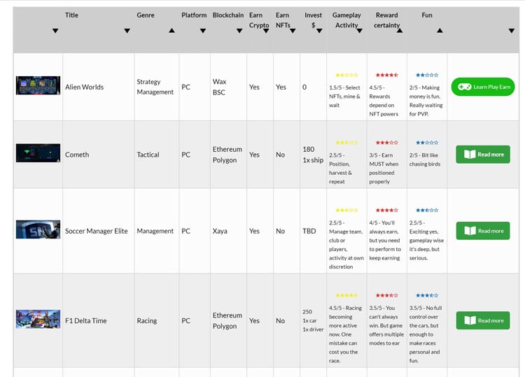 Trong hình dưới đây trích từ trang playtoearn.online cho thấy nhiều loại hình game đã ra đời. Tùy theo game, mà người chơi phải đầu tư một ít ban đầu để sắm sửa, trang bị đồ nghề cho hành trình kiếm cơm của mình trong game.
