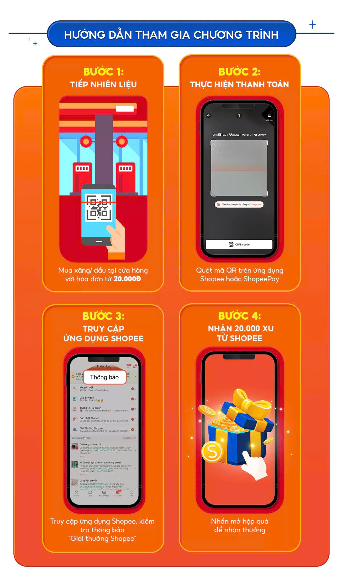 Theo đó, người dùng mua xăng, dầu với hóa đơn từ 20.000 đồng trở lên và thanh toán qua ShopeePay tại các trạm xăng hợp lệ sẽ được hoàn 20.000 đồng dưới dạng Shopee Xu vào tài khoản, tối đa 1 lần/người/ngày.